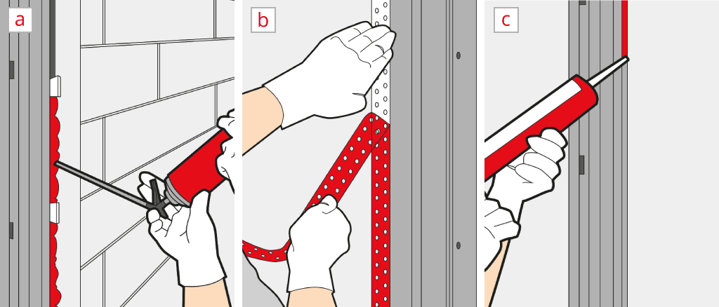 • Appliquez maintenant entièrement le film choisi comme niveau de joint intérieur sur le mur ou utilisez dans le cas échéant le joint acrylique (Fig. 6b ou 6c).