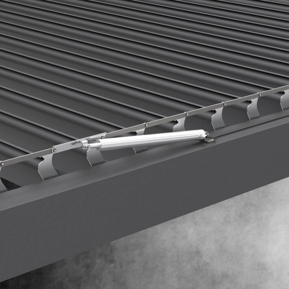 Pergola 4x2Pergola adossée avec manivelle et éclairageManivelle amovibleMoteur de pergolaSystème d'évacuation d'eau latéralePoint d'ancrage (pied) de pergolaÉclairage LED, toit pergola