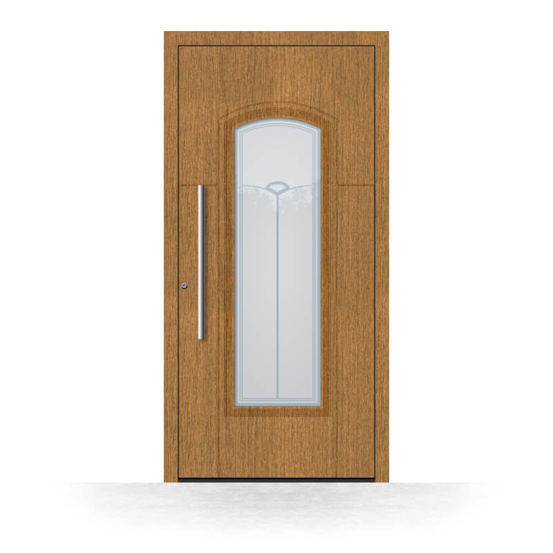 La porte d'entrée en bois Mérignac convainc par ses lignes claires et classiques ainsi que son grand vitrage en arc. Pure et esthétique, elle fournit en même temps une très haute solidité et une bonne isolation thermique grâce aux capacités isolantes des profilés en bois. Ainsi, vous profitez du charme classique du bois ainsi que de ses avantages en matière de construction. Configurez votre porte sur mesure et ajoutez aussi des éléments architecturaux tels qu’une imposte ou des vitres latérales ainsi que des renforts de confort et de sécurité.